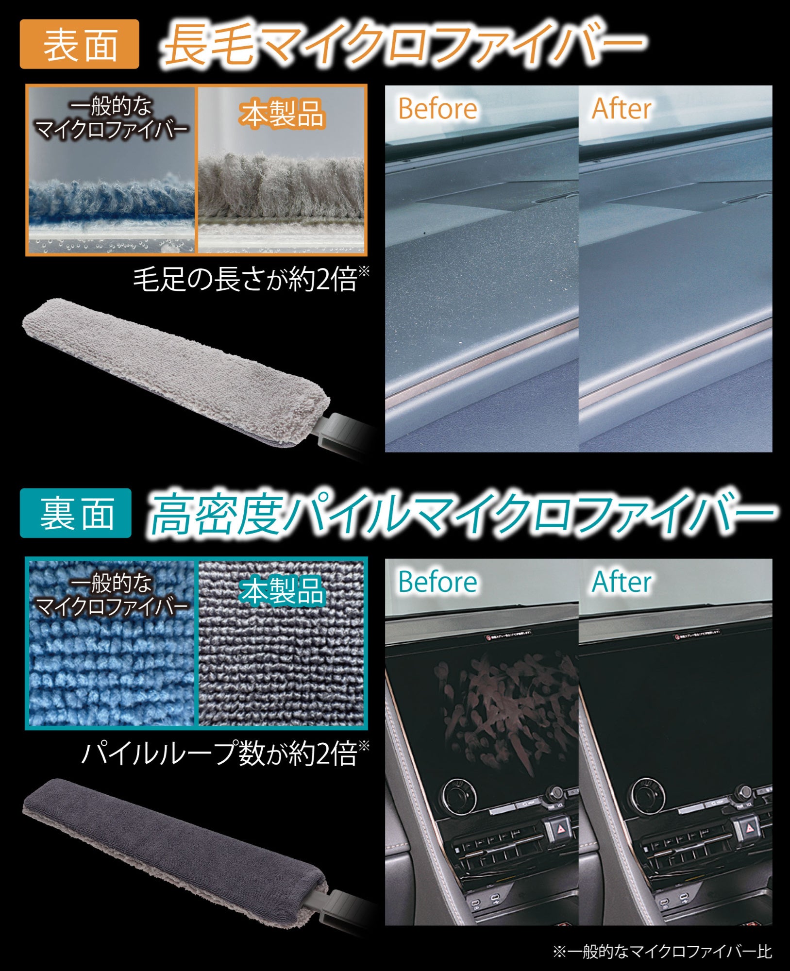 – 表と裏で異なる高性能クロス表面は毛足の長さが約2倍(※)でホコリをしっかりキャッチする長毛のマイクロファイバー、裏面はパイルループ数が約2倍(※)の高密度マイクロファイバーで手アカや指紋をしっかり除去。内窓のくもりも拭き取り可能。※一般的なマイクロファイバー比較