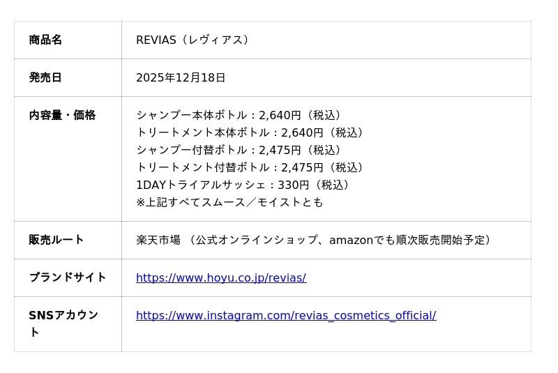 ホーユー株式会社(本社:愛知県名古屋市、代表取締役 社長執行役員:佐々木 義広、以下ホーユー)は、2025年12月18日(木)よりホーユーヘアケア楽天市場にて新ヘアケアブランド「REVIAS(レヴィアス)」を販売開始します。