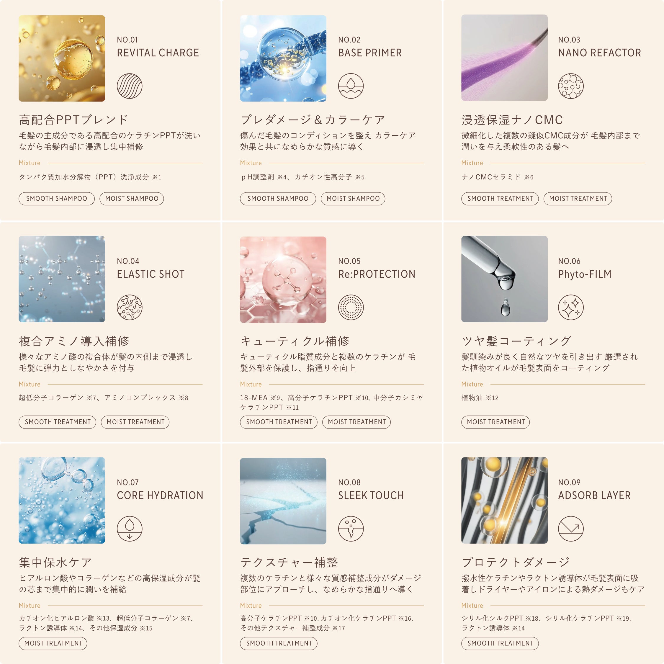 「毛髪構成成分※₃」を中心に、37種類の補修成分で設計された9つの独自処方を1つのヘアケアに。
