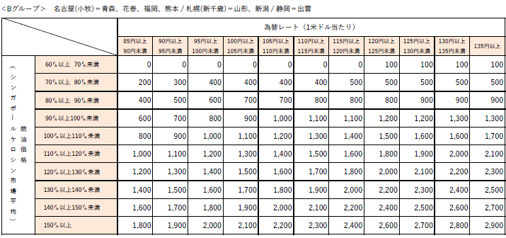 なお、燃油特別付加運賃は、シンガポールケロシン市況価格および為替レートの変動に応じて、 1ヶ月毎に見直しております。