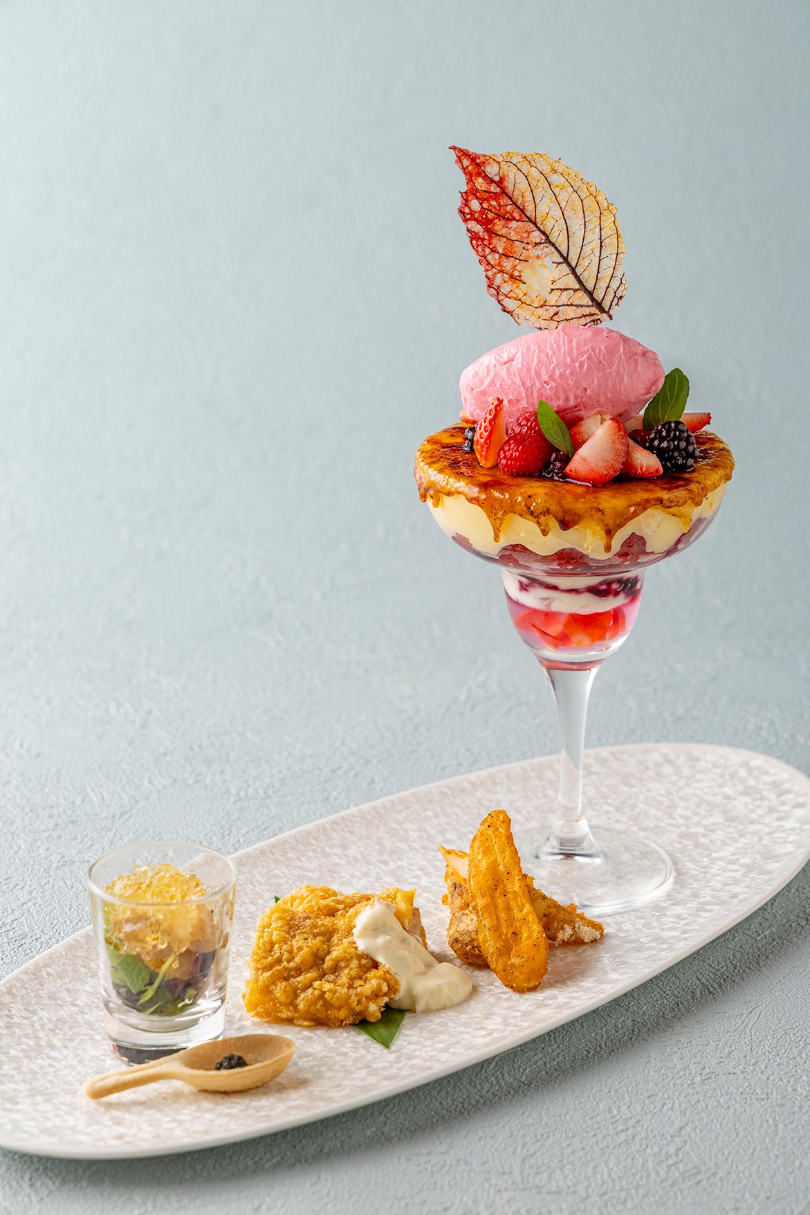 甘酸っぱいいちごを主役に、ローズウォーターのジュレやプーアル茶ブリュレなど、素材が重なり合うごとに香り・食感・味わいが豊かに広がる特製パフェ。その華やかな甘みを引き立てるのが、シェフが趣向を凝らした3種のセイボリーです。ウニの旨み、日南キャビアの風味、鶏の香ばしさが織りなす味わいが、パフェとの絶妙な調和を生み出し、ひとつのストーリーのように楽しめる構成に仕上げました。