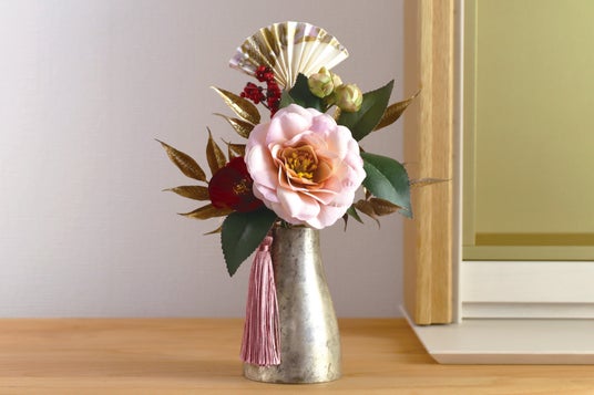 金のさし色と扇子の飾りが特別感のある「メモリアルフラワー正月花 絹」