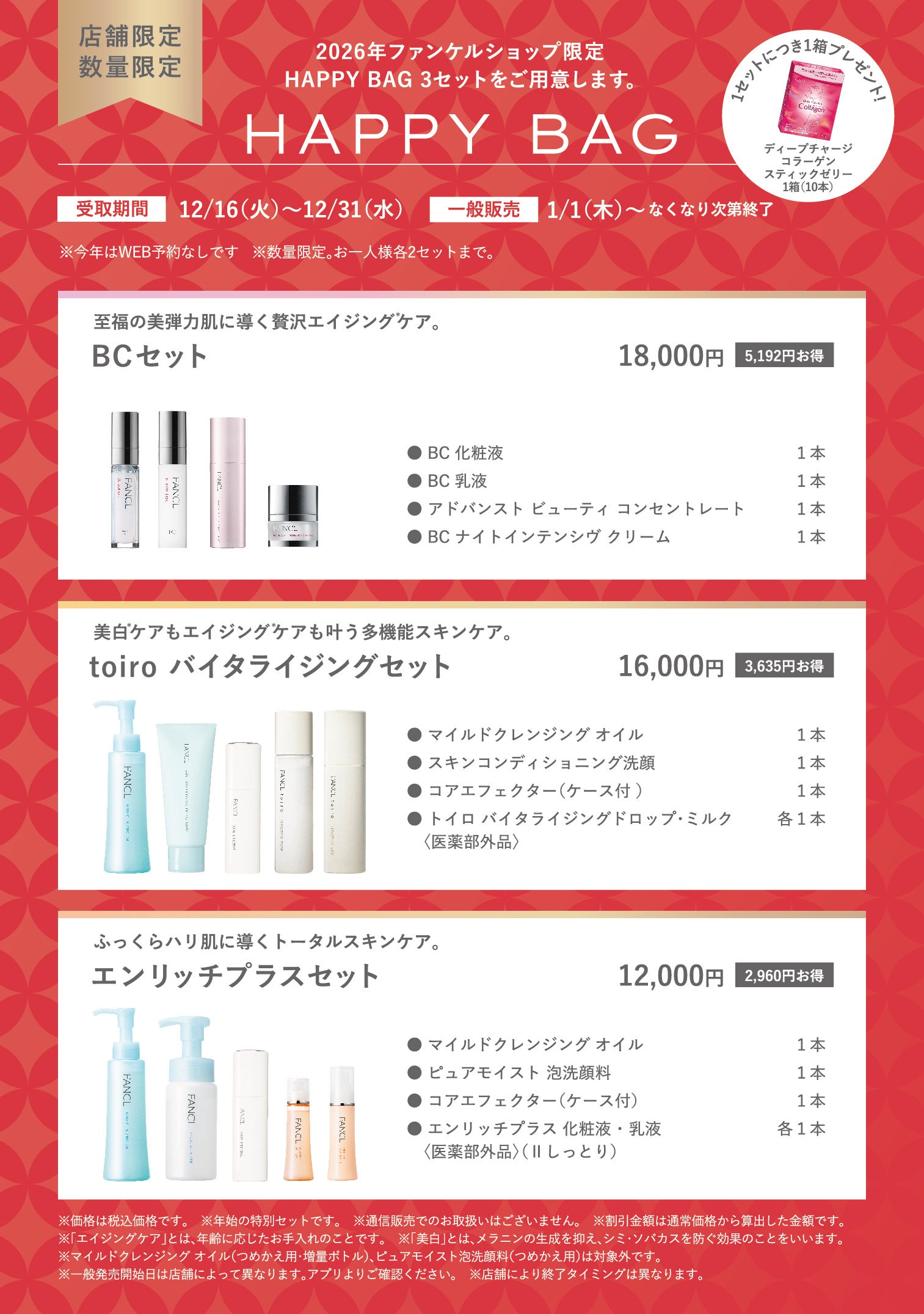 株式会社ファンケルは、日頃のご愛顧への感謝を込めて、12月16日(火)より通信販売および直営店舗にて福袋キャンペーンを開始します。新しい年をお気に入りアイテムとともに迎えていただける、年末年始限定の特別セットを多数ご用意しました。