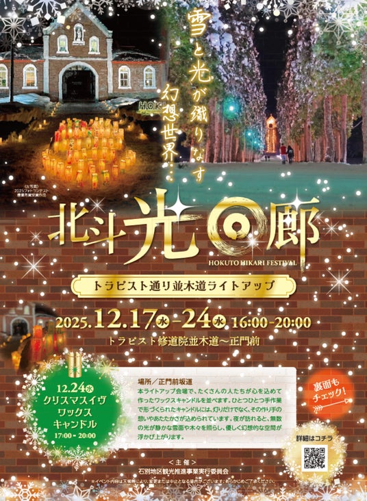 北海道北斗市は、石別地区観光推進事業実行委員会が主催する「北斗光回廊~トラピスト通り並木道ライトアップ~」を、12月17日(水)から24日(水)まで開催いたします。