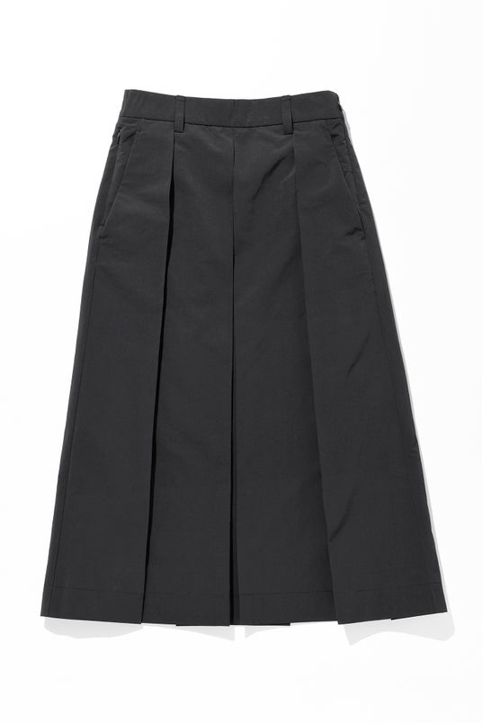 広めに取ったプリーツとミディアムロング丈のシルエットが、大人のスタイルにふさわしい落ち着きと、程よい華やかさを演出します。ウエスト後側に目立ちにくいゴム仕様を採用し、フロントのすっきりとした印象はそのままに、快適な着用感と動きやすさを両立しました。