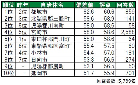 1位は都城市で、昨年2位から一つ順位を上げました。2位は北諸県郡三股町(昨年3位)、3位は児湯郡川南町(昨年8位)で、いずれも昨年から順位を上げました。トップ10内で今回初登場の自治体は9位の児湯郡都農町(こゆぐん つのちょう)で、昨年は累計回答者数が50名未満でランキングの集計対象外でした。その他、昨年は偏差値50未満で順位非公開だった延岡市が、今年は10位となっています。