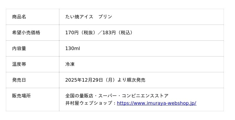 井村屋株式会社(本社:三重県津市高茶屋七丁目1番1号、社長:岩本 康)は、1986年の発売以来、長年お客様に愛され続けているロングセラー商品「たい焼アイス」シリーズから、新商品『たい焼アイス プリン』を、2025年12月29日(月)より期間限定で全国発売します。