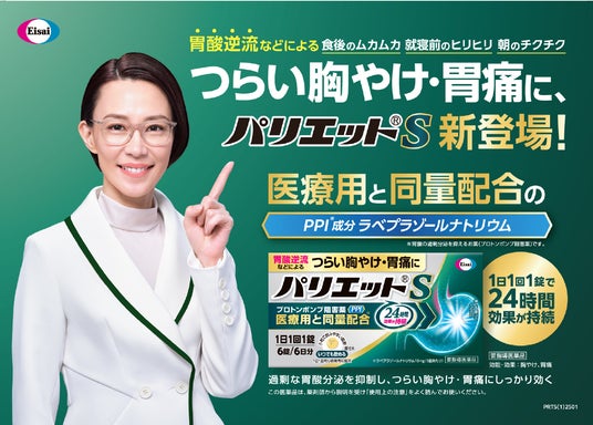 当社の「パリエット(R)S(要指導医薬品)」※1は、PPI成分※2を医療用と同量配合し、つらい胸やけ・胃痛に対して、1日1回1錠で24時間効果が持続。食前食後に関わらず、症状を感じたときにお飲みいただけます※3。胃の不調を感じやすい12月も、快適で安心な毎日を願う生活者の皆様をサポートしてまいります。
