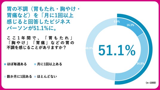●胃の不調(胃もたれ・胸やけ・胃痛など)を「月に1回以上感じる」と回答したビジネスパーソンが51.1%に。