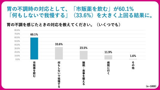 ●胃の不調時の対応として、「市販薬を飲む」が60.1%となり、「何もしないで我慢する」(33.6%)を大きく上回る結果に。