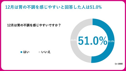 ●12月は胃の不調を感じやすいと回答した人は51.0%。その理由の最多は「ストレス・緊張が高まる」(65.7%) であり、精神的負担の大きさが浮き彫りに。