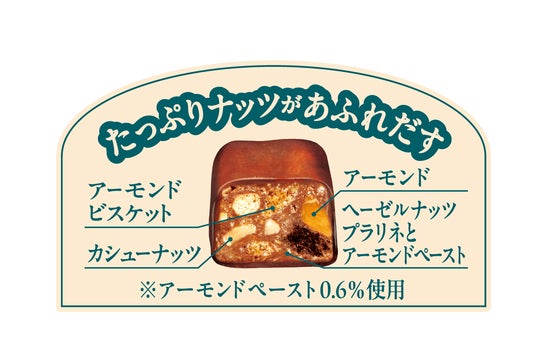 アーモンド、カシューナッツ、ヘーゼルナッツの3種のナッツを贅沢に使用。香ばしいナッツの風味とザクザク食感が特長です。ミルクチョコレートとビターチョコレートのブレンドチョコレートでコーティングし、コク深く豊かな味わいに仕上げました。