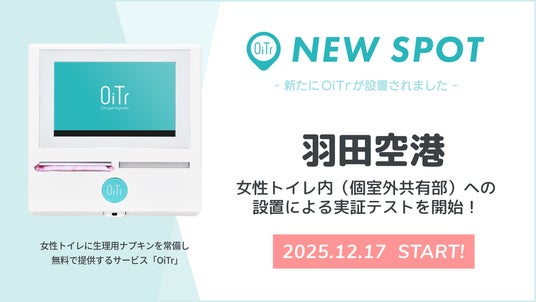 全国の商業施設や交通機関、公共施設、オフィス、学校などの女性個室トイレに、生理用ナプキンを常備・無料提供する日本初のサービス「OiTr(オイテル)」を展開するオイテル株式会社(本社:東京都新宿区、代表取締役:崎山 真)は、「トイレットペーパーのように、個室トイレに生理用品が行き届く社会」の実現を目指し、このたび羽田空港第1・第2ターミナル国内線の保安検査通過後エリア(東京都大田区羽田空港3-3-2)において、女性トイレ内(個室外共有部)への設置による実証テストを2025年12月17日より開始しましたことをお知らせいたします。