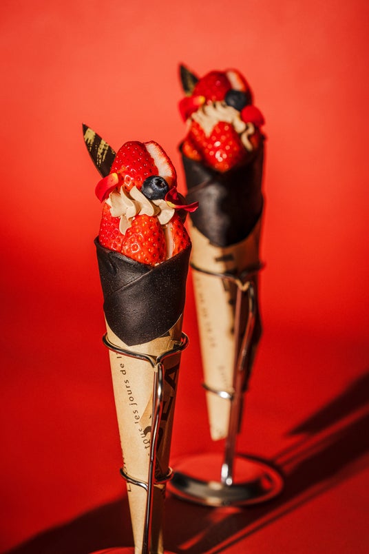 スペシャリテの「いちごティラミスクレープ」は、黒と赤のコントラストが印象的な逸品。ココアパウダーを練り込んだクレープ生地で、フレッシュいちごといちごのコンフィチュールを重ねたなめらかなティラミスクリームを包み、いちごの甘酸っぱさとショコラの甘い余韻が口いっぱいに広がります。
