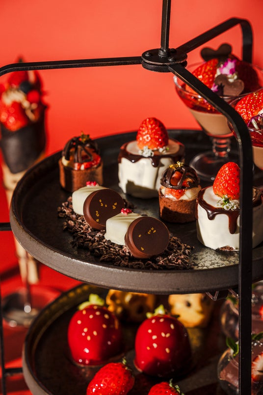 「いちごバレンタインアフタヌーンティー~Rouge et Noir~」は、ご好評いただいている現在開催中の「いちごアフタヌーンティー~Strawberry Symphony~」を、バレンタインをより満喫していただけるようアレンジした期間限定のアフタヌーンティーです。芳醇なチョコレートと色鮮やかないちごを贅沢にあしらい、洗練されたシックな装いで華やかに登場。さらに、フォアグラやホタテなど旬の食材を使ったセイボリーが味わいに深みを添え、大人の優雅なティータイムを彩ります。