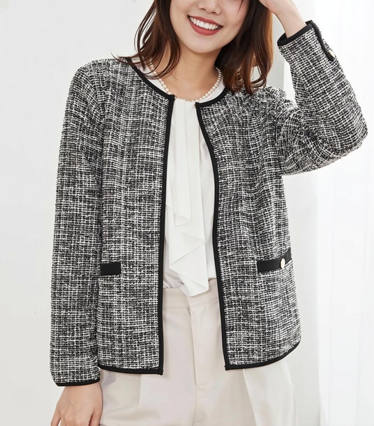 「〈C/S〉ツイード調ジャケット」は、毎年展開するオケージョンジャケットとは一線を画す新デザインと素材を採用しました。きちんと感を保ちながらも動きやすく、着心地の良さが魅力のアイテムです。