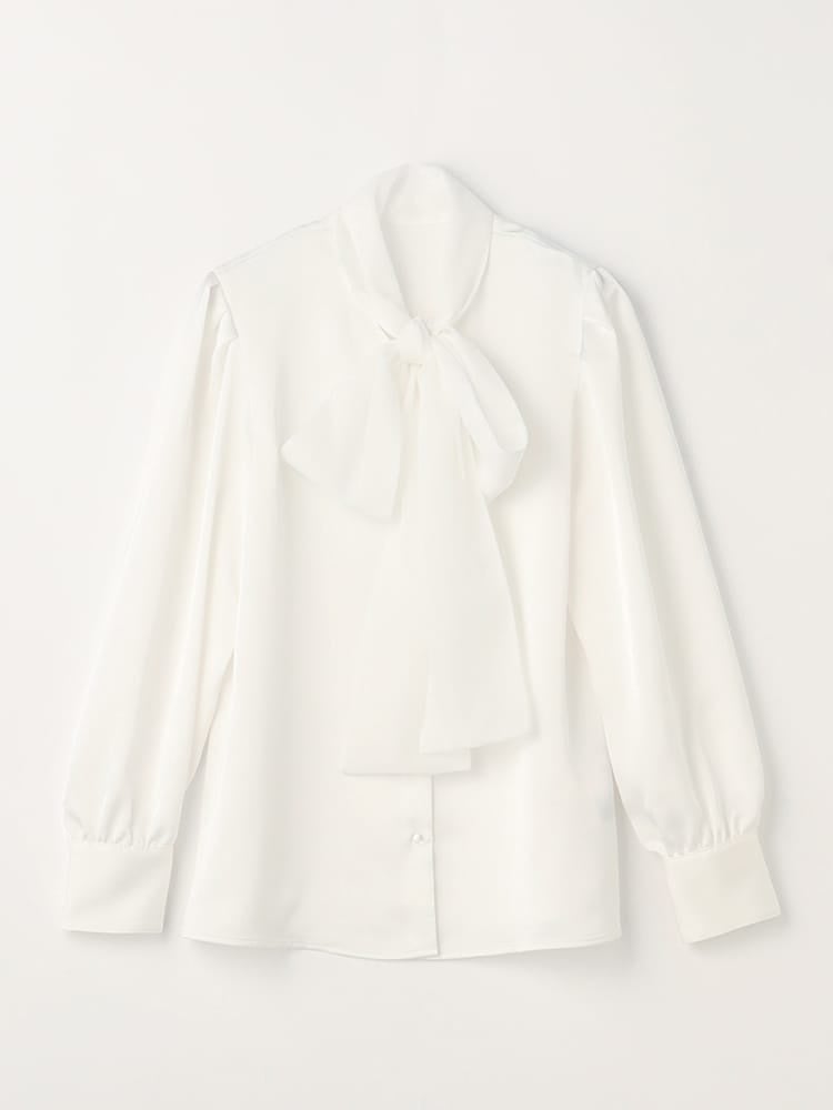 ・大ぶりなリボンデザインで華やかさを演出するブラウスと、オールシーズン活躍するオーガンジー仕様