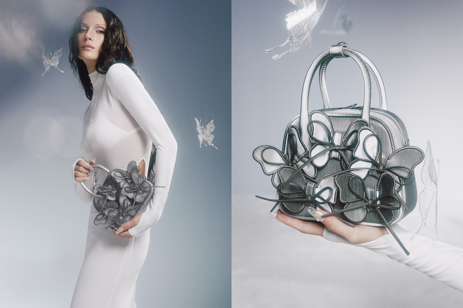 「フリーティングモモバッグミニ」は蝶々のモチーフ飾りが印象的な本コレクションのメインバッグとなります。トートとしてはフェミニンな雰囲気を、付属ストラップを使用すればクロスボディとしても楽しめる 2WAY仕様のアイテムです。