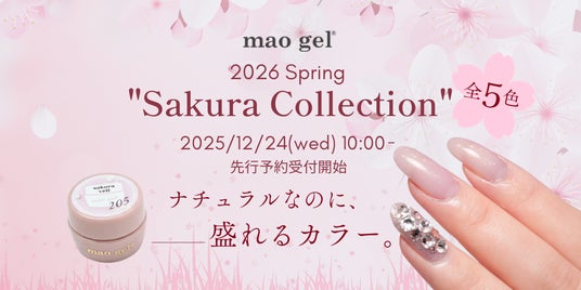 mao nailを運営する株式会社pucklin(本社:大阪市北区)は、2026 Spring 新作コレクション 「Sakura Collection」 として、新色5色の先行予約受付を 2025年12月24日(水)10:00 より開始いたします。発売は 2026年1月5日(月)10:00を予定しております。