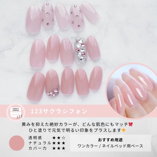薄い膜を重ねたような透け感で、手元の赤みを抑え、澄んだ印象に仕上げます。単色塗りでも完成度の高い仕上がりを叶えるカラーです。