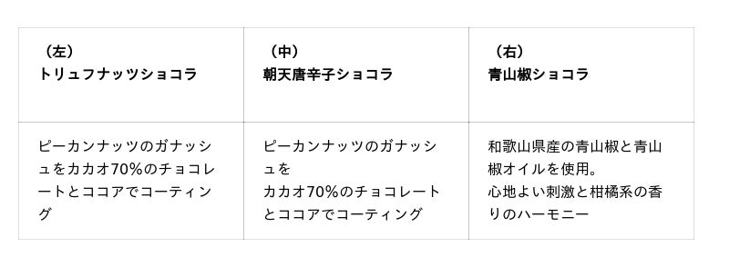 そして、スーツァンレストラン陳では料理長・関根忍が手がける四川料理のスパイスを効かせた3種のフレーバーを1箱に。唐辛子や青山椒など、四川のエッセンスとショコラの絶妙な組み合わせをぜひお楽しみください。