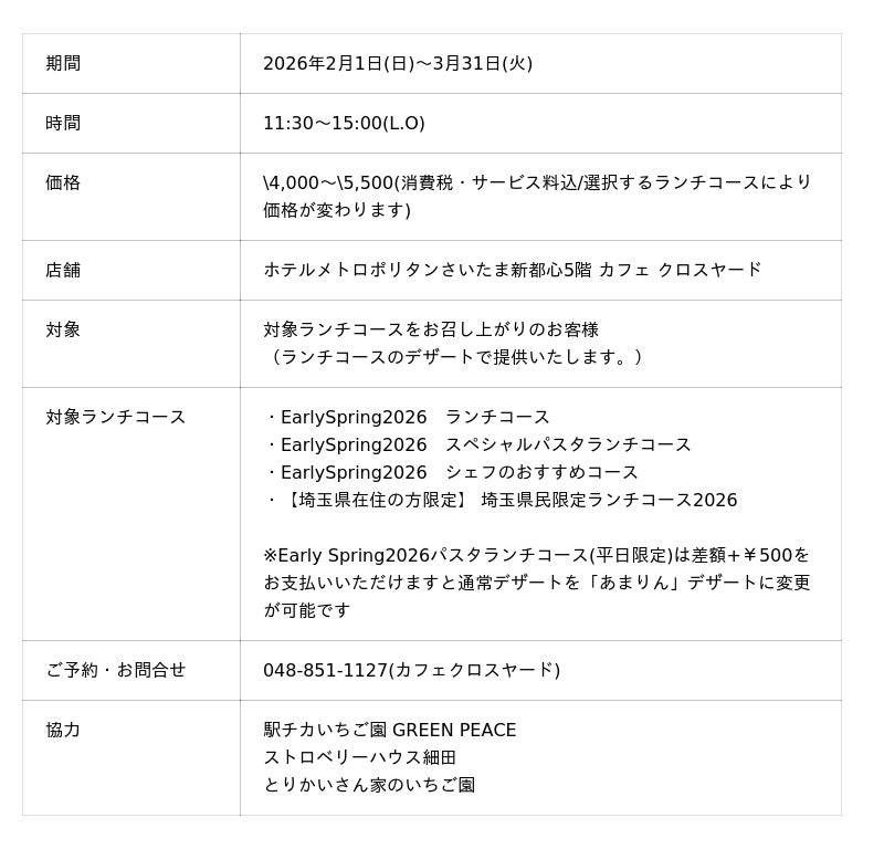 ホテルメトロポリタン さいたま新都心(所在地/さいたま市中央区、総支配人/櫻井浩一)のカフェクロスヤードでは、埼玉県オリジナルいちご品種「あまりん」を使ったデザートを、対象のランチコースをお召し上がりのお客さまに提供いたします。
