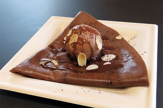 パティスリーならではのクレープショコラキャラメルに、クレームグラッセショコラとチョコレートソースをトッピング。カカオ入りそぼろクッキーのアクセントも楽しめる一品。