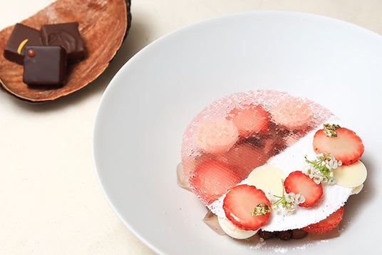 薄い飴の下にはいちごとクレームショコラ。味わいに小さな驚きをもたらすバジルといちごのマリネが隠された、食感と香りのかくれんぼを楽しむ一皿。
