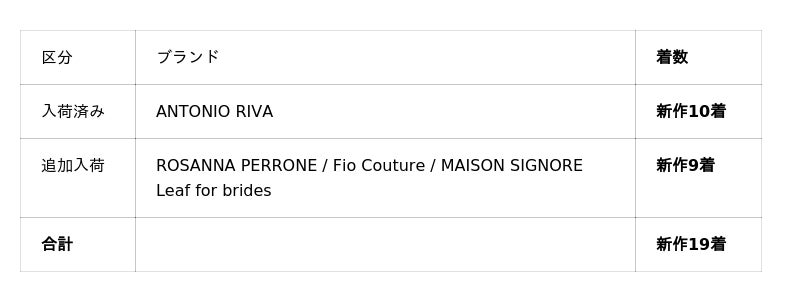 今回入荷するのは、既に入荷済みのANTONIO RIVA新作10着に加え、ROSANNA PERRONE、Fio Couture、MAISON SIGNORE、Leaf for bridesの新作ドレス9着、合計19着。いずれも当店で日々花嫁様と向き合うドレススタイリストが、世界各地の展示会やデザイナーアトリエで発表されたコレクションの中から、「花嫁が着た時の美しさ」を基準に、現場のドレススタイリストが一着一着見極めて選定しています。