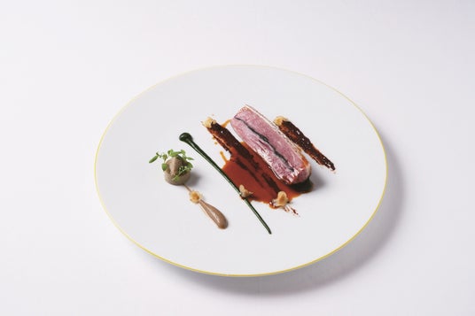 京都・七谷鴨の胸肉にトリュフを挟み込み、⽪は香ばしく中は柔らかくロゼ⾊に焼き上げました。カカオニブの心地よい苦みと濃厚なソースが絡みます。