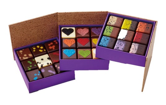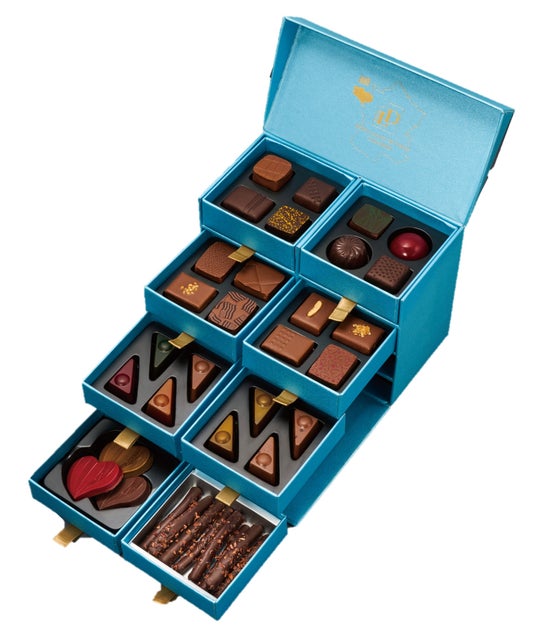 2026年のおすすめガナッシュ9種に、ヘーゼルナッツとコリアンダー、クラッシュカシューナッツなどのプラリネ9種、キャラメル&とうもろこしのプラリネなど2層のビークーシュ9種が詰まった豪華な3段BOX。