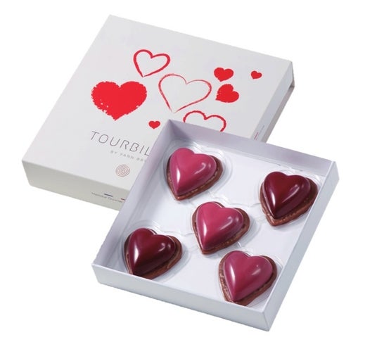 サブレの上にイチゴ風味のガナッシュをのせた⾚いハートとレッドベリーティーのガナッシュをのせたピンクのハートがキュート。赤いハートは新作です。