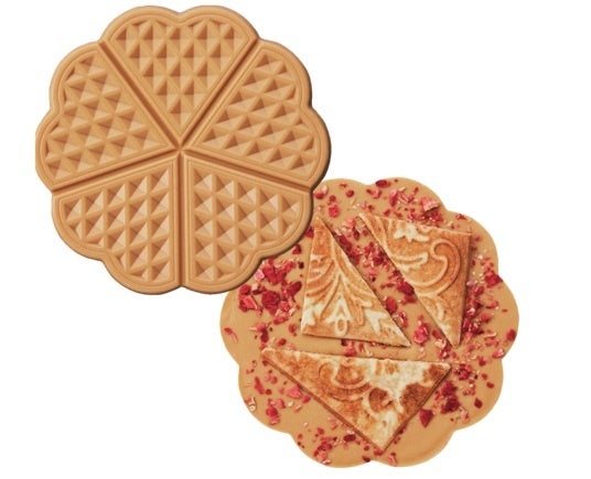 キャラメライズしたホワイトチョコと伝統的なメソッドで作られたブラウンチーズを使用。自社で焼き上げたワッフルやドライ苺をトッピングしました。