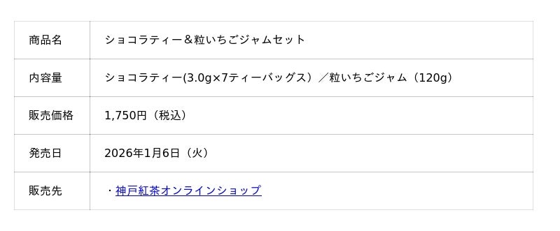 神戸紅茶株式会社(本社:兵庫県神戸市東灘区住吉浜町、社長:丸山 輝真)は、2026年1月6日(火)より、バレンタインティー「ショコラティー」を神戸紅茶オンラインショップにて数量限定で販売を開始します。