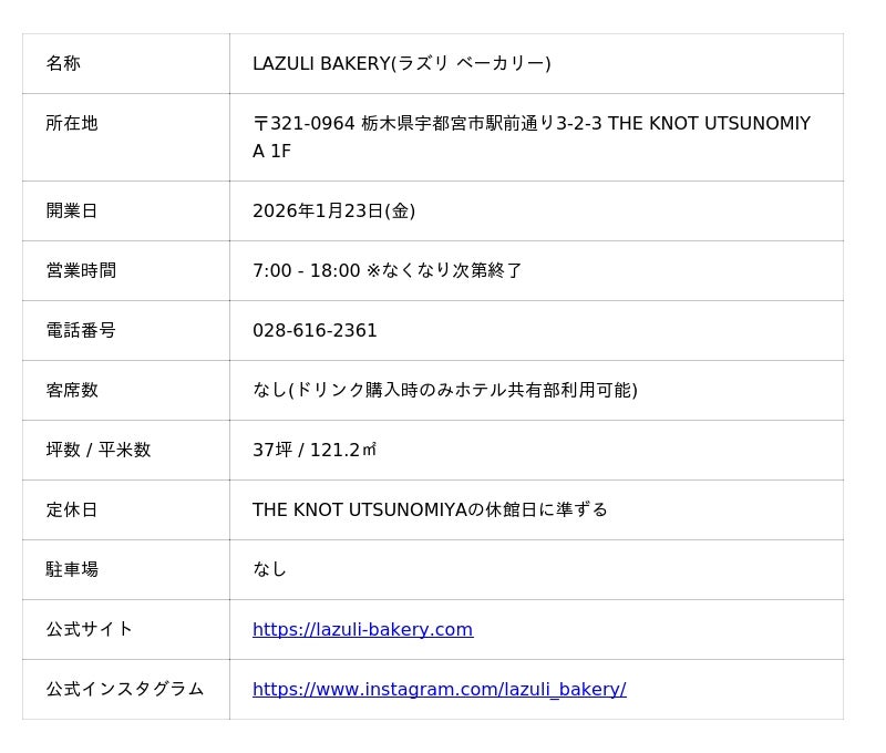 LAZULI BAKERYは、THE KNOT UTSUNOMIYAの1Fに位置する朝から夕方まで営業するベーカリー。パンやドーナツを中心に、焼き菓子やジャム、シロップなど、日常に寄り添うアイテムを手づくりでご用意。宿泊者だけでなく、街の人々にもひらかれた「プロビジョン(食材庫)」として、気軽に立ち寄れる場所を目指します。