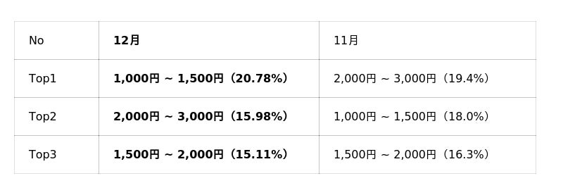 当月(12月)と前月(11月)を販売価格帯別に比較すると1,000円~1,500円の低単価価格帯における販売比率が再び大きく増加し、12月は再度1位となりました。背景には複数の要因が考えられますが、特に大きな影響として、クリスマス需要を背景とした「おもちゃ・ホビー」関連商品の販売拡大が挙げられます。具体的には、積み木ブロック、カップケーキトイ、ディズニー系キャラクター商品等、同価格帯に属するおもちゃカテゴリの売上が大きく伸長しました。