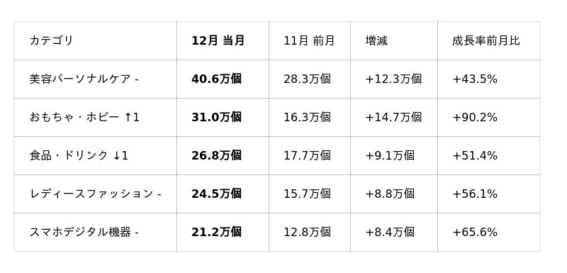 12月は、1位~3位を「港ダイニングしおそう」の商品(カニ、海ぶどう、つぶ貝などの海鮮食品)が占め、上位を独占する結果となりました。一方、10月・11月と2か月連続で1位を獲得していた**「ふわふわブランケット(店舗:Cashio)」はTOP10圏外となっています。また、10~11月にかけて急速に販売を伸ばした「お米(新米)」は16位に1商品がランクインしたものの、販売数量全体としては大きく減少**しています。4位には、前月より順位を上げた**「ビタミンCサプリ(店舗:ELLISS-エルリス-)」がランクインしました。5位には「インソールシューズ(店舗:COSYLEE)」が新規ランクインしており、単価200円前後の低価格インソールが12月に約1万個販売されています。さらに、8位・9位には12月のクリスマス需要を背景としたおもちゃ・TOY系商品**がランクインしており、季節要因の影響が色濃く表れています。