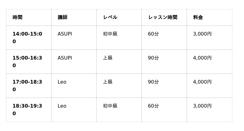 – – 初中級クラス: 3,000円(60分)