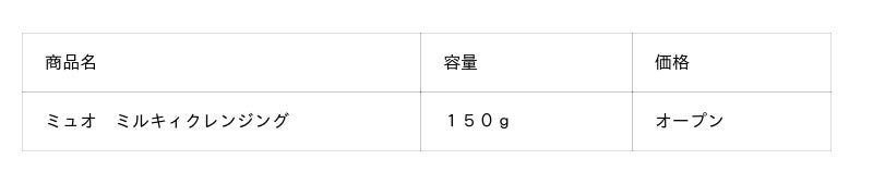 そこで、メイク落ちと肌あたりのよさを両立するクリームタイプの「ミルキィクレンジング」を「ミュオ」のラインアップに加えました。2種の植物オイル「ホホバ種子油」「カニナバラ果実油」を配合した「hybrid処方」のクリームが、メイクや皮脂になじみ、落ちにくいメイクや毛穴の汚れをまるっと溶け落とします。また、2種の植物エキス「ユズ果実エキス」「ハマナス果実エキス」配合で、うるおって毛穴が目立たない肌へと導きます。