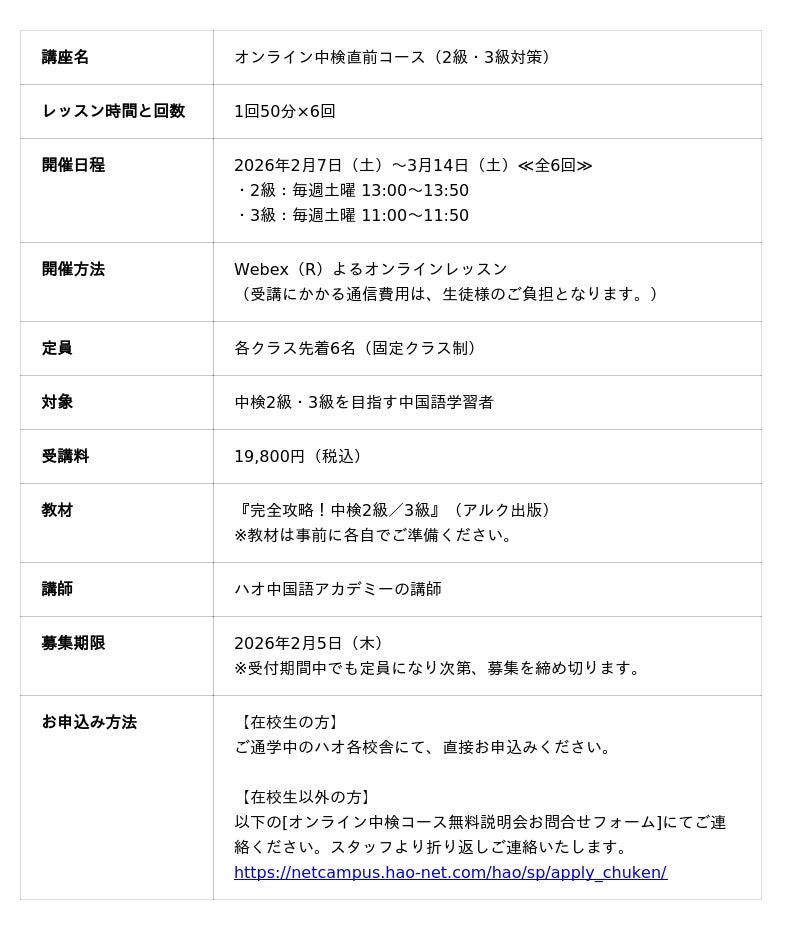 さらに、ハオでは中検合格を後押しするため、オンライン中検直前コース(2級・3級)や、中検攻略無料ウェビナー(在校生対象)の開催も予定しています。無料ウェビナーは、2026年1月24日(土)と31日(土)の2回実施し、試験攻略法や学習計画の立て方、キャッシュバック申請方法をご案内します。