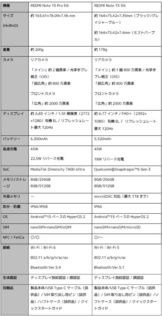 ■REDMI Note 15 Pro 5G / REDMI Note 15 5Gのスペック概要
