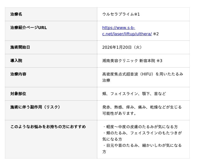 湘南美容クリニック(本社:東京都新宿区)は、次世代たるみ治療器「ウルセラプライム」の提供を2026年1月20日(火)より湘南美容クリニック新宿本院にて開始します。