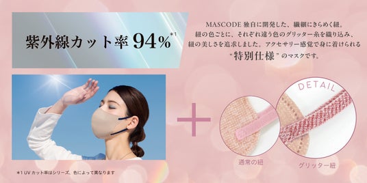 株式会社サン・スマイル(本社:東京都港区/代表取締役社長:田中徳也)は、ファッション性と機能性を両立させたマスクブランド『MASCODE(マスコード)』より、2024年秋に誕生した「マスコード3Dマスク グリッターシリーズ」のUVカット機能付きを発売いたします。今シーズンのトレンドカラーであるピンクを中心としたカラー展開(3色・Mサイズのみ)で、春先の紫外線対策とファッション性を両立しました。