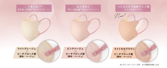 マスク本体は着用するとそれぞれ雰囲気が異なる絶妙な3色展開、紐はトレンド感のあるピーチブロンズグリッターとなっています。