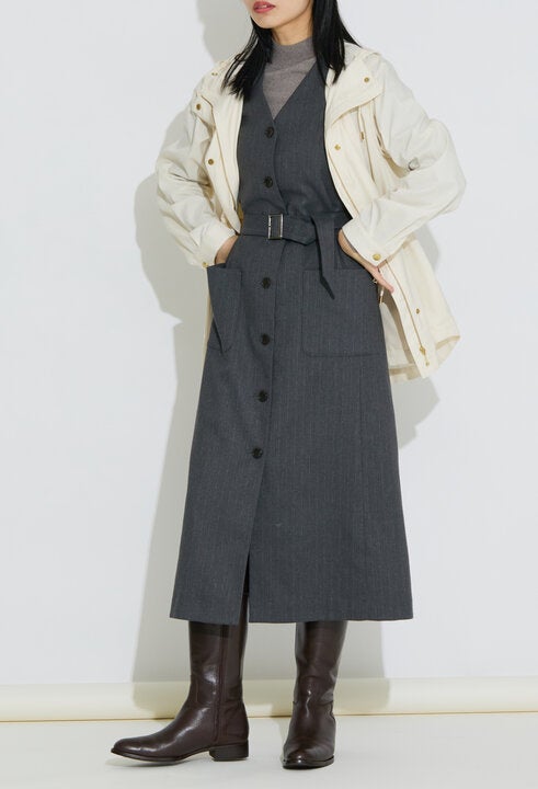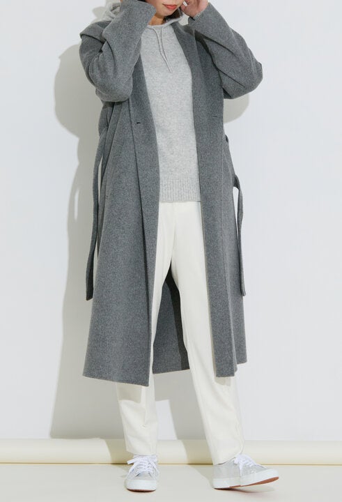 都会的な洗練を纏うグレーのロングコート。細番手ウール×ナイロンのリバー素材で、軽やかさとあたたかさを両立。春はホワイトのパンツを合わせるだけで、装いに新鮮な抜け感が生まれます。
