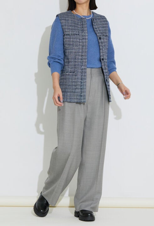 羽織るだけで一格上のスタイリングが叶う、華やぎツイードジレ。冬のコートインスタイルも、春はジレに替えて気分を更新。ニット×ワイドパンツの定番コーデに重ねるだけで、装いが一気に春らしくシフトします。