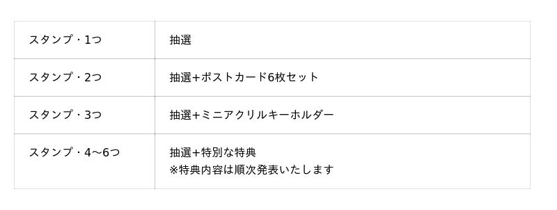 ご来場ごとにスタンプを1つ付与。当日から使える、カフェや劇場内公式グッズショップの割引券やスマホ壁紙が当たる抽選にご参加いただけるほか、集まったスタンプの数に応じてポストカード・ミニアクリルキーホルダーなど、ここでしか手に入らない特別な特典をお受け取りいただけます。