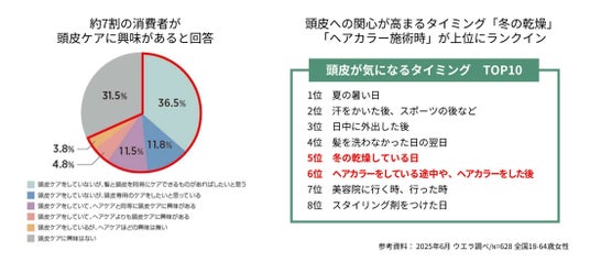 ウエラの調査によると、68.4%の消費者が頭皮ケアに興味を持っていながらも、そのうちの約7割はまだ頭皮ケアを始めていないことがわかりました。また、頭皮への関心が高まるのは、「夏の暑い日」や「スタイリング剤をつけた日」など、汗や頭皮の汚れが気になるタイミング以外に、「冬の乾燥している日」「ヘアカラーをしている途中や、ヘアカラーをした後」といった頭皮に乾燥や違和感を感じやすいタイミングも上がっています。