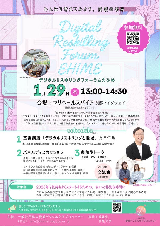 一般社団法人 愛媛デジタル女子プロジェクト(所在地:愛媛県松山市、代表理事:飯野 めぐみ)は、2026年1月29日(木)、対話型フォーラム「Digital Reskilling Forum EHIME」を開催します。変化の速いデジタル社会の中で、地域でもデジタル人材育成と学び直しの必要性が高まっています。後援:愛媛県・愛媛大学のもと、学び直しや働き方に関心のある個人に加え、企業、行政、大学・教育機関、支援機関など多様な立場の参加者が集い、デジタルリスキリングを切り口に、地域の人材育成と働き方の選択肢について語り合う場をつくります。