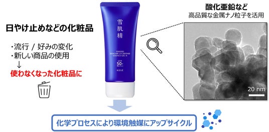 株式会社コーセー(本社:東京都中央区、代表取締役社長:田中 慎二)は、東京大学 高鍋・小畑・岸本研究室との共同研究により、使わなくなった化粧品を環境触媒へとアップサイクルする技術の開発に着手します。これは日やけ止めをはじめとする化粧品に含まれる酸化亜鉛などの金属酸化物に独自の化学プロセスを施すことで、環境浄化や資源循環、エネルギー分野への活用が期待される触媒に生まれ変わらせる技術です。すでに酸化亜鉛を用いた技術については特許出願済みであり、今後は他の金属酸化物への展開や応用領域の拡張も視野に入れ、実用化に向けた研究開発を加速していきます。本研究は国立研究開発法人新エネルギー・産業技術総合開発機構(NEDO)の助成を受けており、国際ナノテクノロジー総合展・技術会議nano tech 2026(2026年1月28日~30日、東京)のNEDOブースにてポスター展示します。
